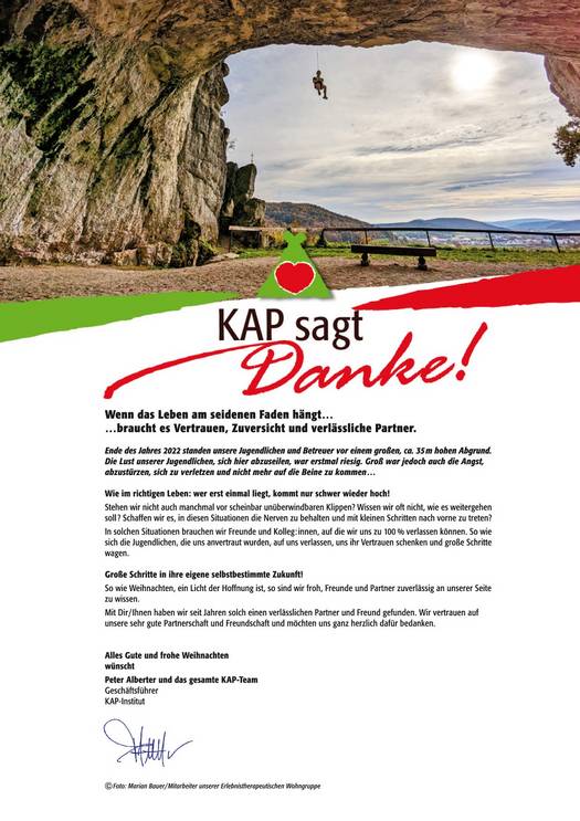 Gemeinsam werden wir am Anfang leichte und später anspruchsvolle Jurahöhlen im Gebiet von Laaber und Altmühl befahren. Beim ersten Einstieg in die Unterwelt zeigen Rücksichtnahme, das gegenseitige Helfen und aufeinander Warten, wie bedeutsam und unterstützend Teamwork sein kann. Die enorme Konzentration, das Miteinander, die Geborgenheit und Sicherheit der Gruppe helfen, sich mit dem Ungewissen auseinanderzusetzen und gleichzeitig mit völlig fremden Sinneswahrnehmungen fertig zu werden.