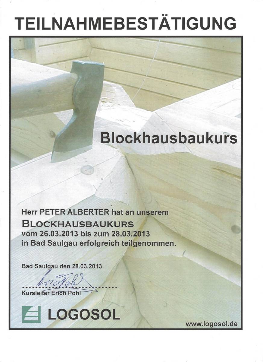 Mit diesem Zertifkat schloss Peter Alberter, Gesamtleiter des KAP-Instituts sein Seminar zum Blockhausbau ab. Im Rahmen der 3-tägigen Fortbildung wurden verschiedenste Inhalte zum Thema Blockhausbau vermittelt: Umgang mit diversem Werkzeug, Vermessen und Einpassen der Stämme, Einbau von Fenstern und Türen, usw.