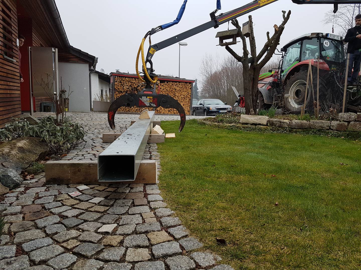 Die Baustelle für die nächsten Tage bei uns: unser Baumhaus… Wir müssen dringend den alten Trägerbalken austauschen und durch einen neuen (Metall-)Balken ersetzen. Auf einer Seite haben wir dies vor ein paar Jahren schon gemacht, auf der zweiten Seite passiert dies jetzt… Den Balken haben wir schon aus unserer Halle geholt und mit dem Rückewagen (das Ding wiegt ca. 300kg ;-)) abgeladen. To be continued…