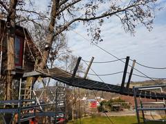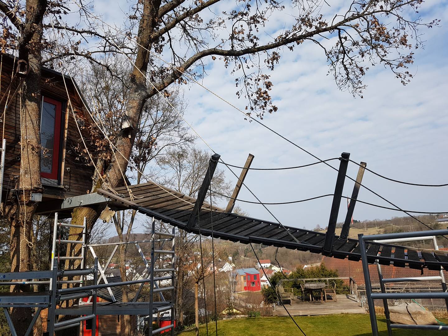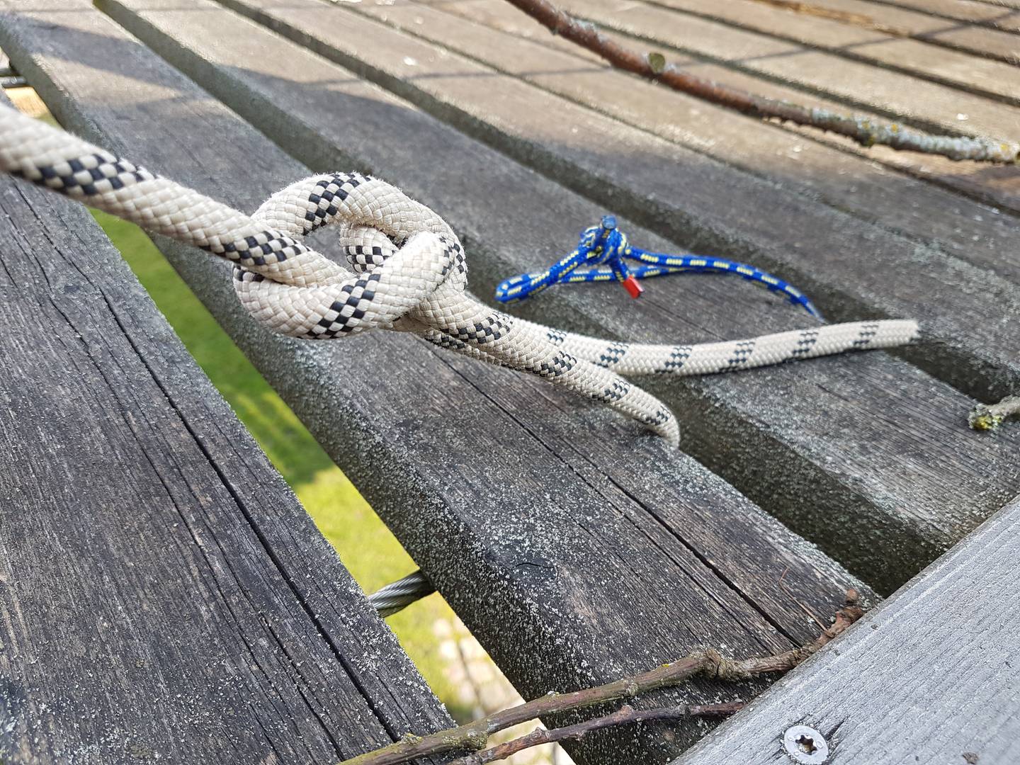 Mithilfe unserer Seilwinsch und der Umlenkung wurde die Hängebrücke ein Stück hochgezogen, und dann an drei verschiedenen Punkten mithilfe von Edelrid-Statikseilen am Baum befestigt. Somit konnte der Trägerbalken von der Brücke "befreit" werden.