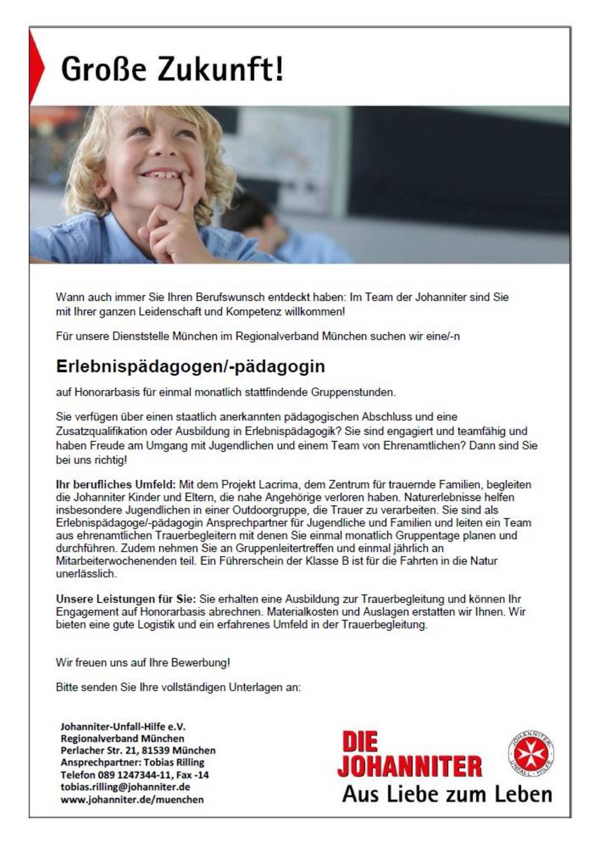 Ihr berufliches Umfeld: Mit dem Projekt Lacrima, dem Zentrum für trauernde Familien, begleiten die Johanniter Kinder und Eltern, die nahe Angehörige verloren haben. Naturerlebnisse helfen insbesondere Jugendlichen in einer Outdoorgruppe, die Trauer zu verarbeiten. Sie sind als Erlebnispädagoge / -pädagogin Ansprechpartner für Jugendliche und Familien und leiten ein Team aus ehrenamtlichen Trauerbegleitern mit denen Sie einmal monatlich Gruppentage planen und durchführen. Zudem nehmen Sie an Gruppenleitertreffen und einmal jährlich an Mitarbeiterwochenenden teil. Ein Führerschein der Klasse B ist für die Fahrten in die Natur unerlässlich.