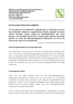 Vor 20 Jahren entstand das KAP-Institut aus einem Reiseprojekt heraus. Der heutige Gesamtleiter Peter Alberter war mit einem Jugendlichen im 1:1 Kontext im Rahmen einer Jugendhilfemaßnahme von Agadir / Marokko mit dem Mountainbike unterwegs nach Deutschland. Damals berichteten viele Fachzeitschriften über die erfolgreiche Maßnahme.