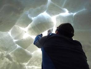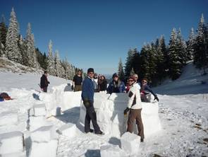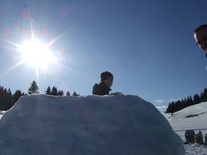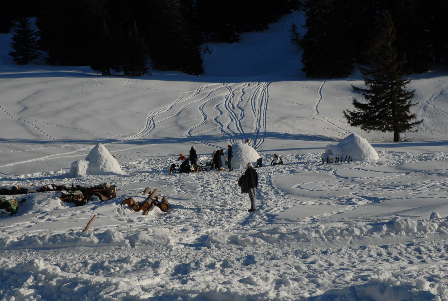 Gemeinsam bauen wir Iglus mit der klassischen Steinmethode, die entsprechend der Schneequalität aus der Schneedecke ausgesägt oder mit Formen zu Steinen gepresst werden. Mit einer Neigung nach innen werden diese Steine Reihe für Reihe aufeinander geschichtet, bis sich die Kuppel schließt. Koordination und Teamleistung sind hier gefragt. Je nach Teilnehmeranzahl wird eine entsprechende Anzahl an Iglus errichtet.