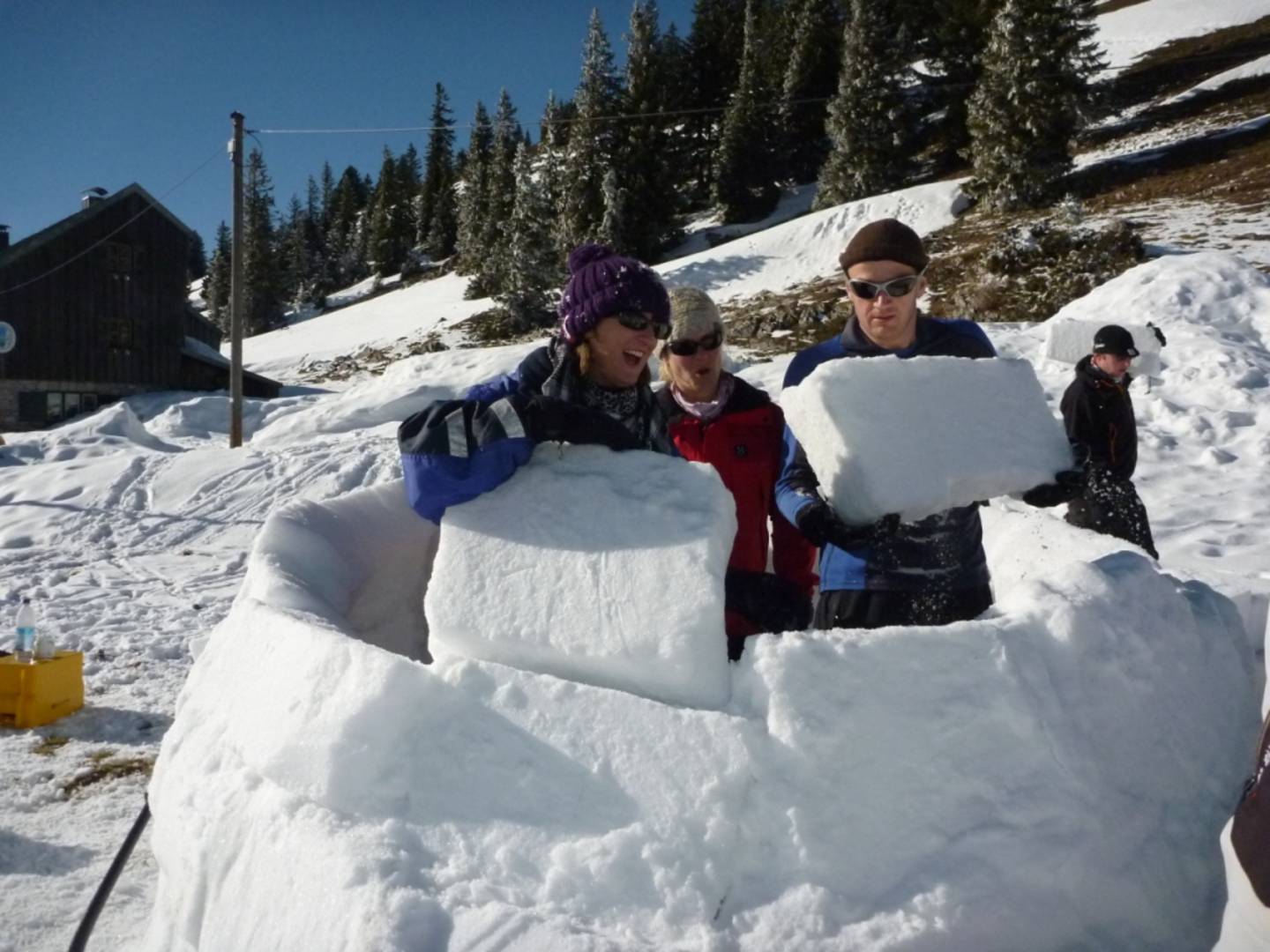 Schlussendlich ist das Iglu fertig aufgebaut: das erfolgreiche Team begibt sich ins Innere des Iglus, um gemeinsam eine gemütliche Mahlzeit, oder einen wärmenden Tee zu sich zu nehmen. Natürlich besteht auch die Möglichkeit, die Funktionalität des Iglus auf die Probe zu stellen und darin zu übernachten… Ein Outdoor-Erlebnis der besonderen Art!!