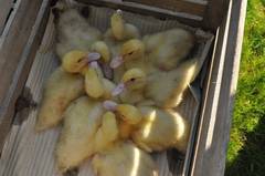 Sehr mutig übrigens, die Kleinen - sie saßen ganz entspannt in ihrer Kiste, haben sich neugierig umgesehen, aber das wars dann auch. Hier haben unsere Gänse im vergangenen Jahr bedeutend mehr Radau gemacht ;-)
