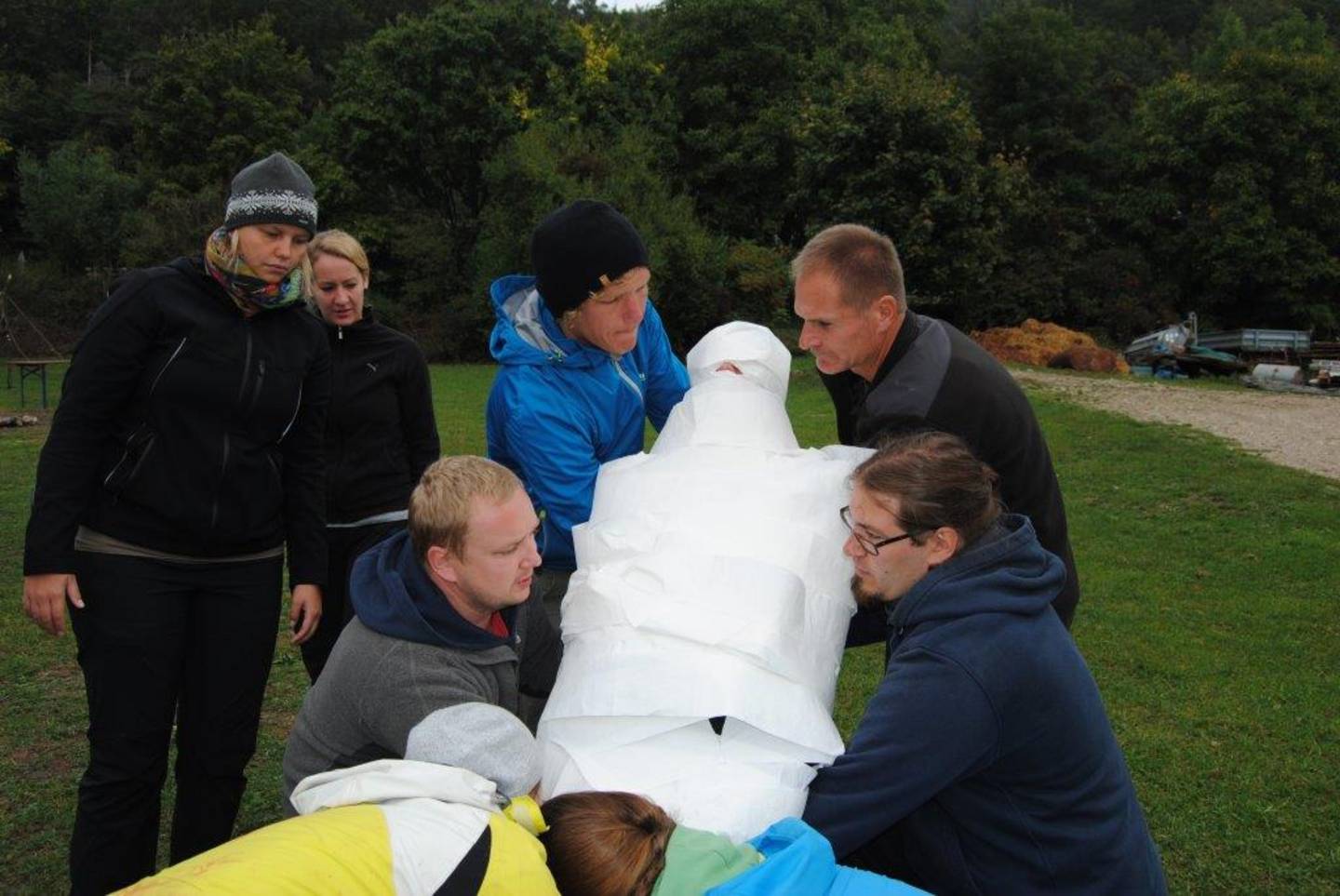 Der Pflichtkurs „Erste Hilfe Outdoor“ der Ausbildung Erlebnispädagogik fand auch in diesem Jahr wieder unter der bewährten Leitung von Sebastian Clavee statt. Von 21. bis 25. September 2015 waren 18 angehende Erlebnispädagogen auf dem Campingplatz Kastlhof bei Essing damit beschäftigt, verletzten Personen zu helfen, Notrufe abzusetzen, stabile Seitenlage zu üben, Verbrennungen zu kühlen, Amputationen und Platzwunden zu versorgen, Druckverbände anzulegen, usw.