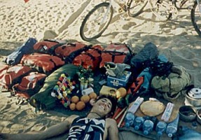 "Nach insgesammt 20 km schlug Tim vor, es für den heutigen Tag zu belassen. Er wolle auf der Stelle einen geilen Zeltplatz, schließlich sei er völlig ausgelutscht. Da er keinerlei Interesse zeigte unsere geplante Route weiter zu fahren, bogen wir auf der Stelle Richtung Meer ab. Völlig orientierungslos, genervt und entscheidungsunfähig überlegte er, ob wir nun jetzt hier an diesem potthäßlichen Platz bleiben sollten. Oder doch den ganzen Berg wieder hochstrampeln und es auf`s neue an einem anderen Platz versuchen sollten. Womöglich wäre dieser noch schlechter als der schon jetzt entdeckte. Was nun? Mir war es egal. Weiterfahren oder hier bleiben! Nach 2 1/2 Stunden (!) abwägen, schimpfen und fluchen entschied er sich für weiterfahren. Als wir letztendlich noch über einen steilen Abhang in eine Sackgasse fuhren, schien der Tag für ihn gelaufen zu sein." Tim schrieb hierzu in sein Tagesdokumentationsbuch: "Das ist die reinste Tour der Leiden. Habe 2 1/2 Std. überlegt, weiterfahren, nicht fahren? Pause machen, weiter! Grauenhaft. Kein Wasser, nichts zum Essen. Also weiterfahren. Konnte mich nicht mit Peter darüber rumprügeln, weil ich das gaanz alleine entscheiden durfte. Scheiße!"