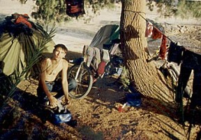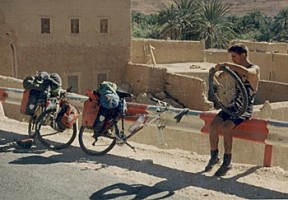 Großes Unbehagen bereiteten uns die kleineren und größeren kapitalen Schäden an den Mountainbikes. Viele Verschleißteile hielten den Belastungen nicht Stand. Neben der Reparatur von abgebrochenen Rahmenhalterungen und Gepäckträgern mußten wir etliche Radlager, Kettenumwerfer, Zahnräder und Schalteinheiten auswechseln. Insgesamt fuhren wir an die 100 platte Reifen und wechselten ca. 70 Speichen, zweimal pro Rad die komplette Bereifung und einmal ein komplettes Laufrad. Als qualvoll und kaum zu bewältigen stellte sich für Tim das rechtzeitige Waschen seiner Kleidung dar. Ebenso schwer fiel es ihm, in seinen Packtaschen eine gewisse Ordnung zu halten. Schmutzwäsche trennte er von der sauberen so gut wie nicht. Er stopfte seine Kleidungsstücke zerknüllt, im Bündel, in die Packtaschen oder befestigte sie außerhalb der Taschen, unter den Spanngummis. So verlor er mehr und mehr seiner Kleidungsstücke. Oder er warf er seine unsaubere Unterwäsche und Strümpfe einfach weg. Auf diese Problematik angesprochen, zeigte er in den ersten Monaten wenig Einsichtig. Stets reagierte er mit der trotzigen Bemerkung, es würde sich um sein Eigentum und seinen Privatbereich handeln und nicht um meinen. Sein Verlust wurde ihm erst im Atlasgebirge richtig deutlich, wo ich ihm mit Strümpfen als Handschuhersatz aushelfen mußte, um ihn so gegen Erfrierungen zu schützen. Erst nach diesem Zeitabschnitt bemerkte ich, daß er vermehrt auf seine Kleidungsstücke und auf sein Material achtete.